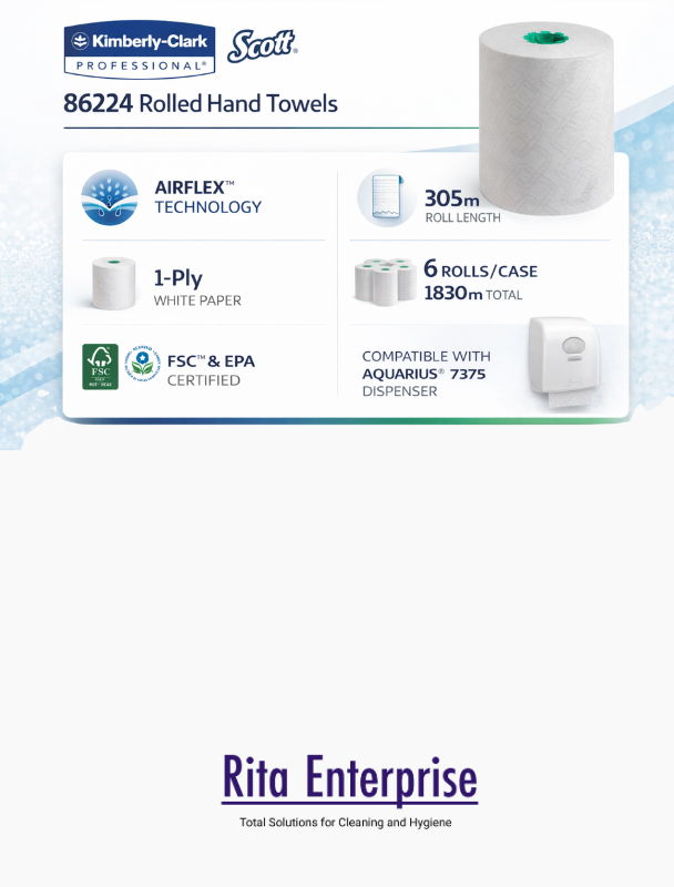 Rita Enterprise proudly presents the 86224 Kimberly Clark rolled hand towel — a superior hygiene solution designed for modern businesses. As a trusted distributor of Kimberly-Clark Professional® products, Rita Enterprise ensures clients across India receive high-quality, sustainable cleaning essentials for their workplaces. The 86224 Kimberly Clark hand towel roll embodies reliability, cost-efficiency, and environmental responsibility—perfectly crafted for high-traffic washrooms and professional spaces.
